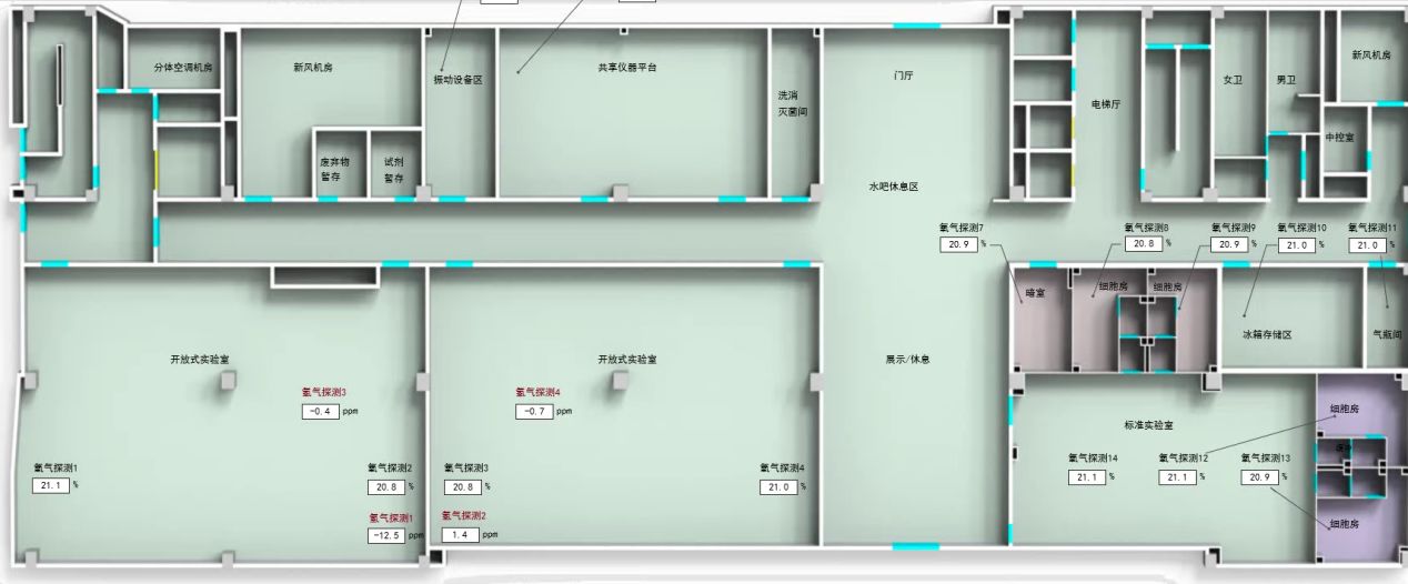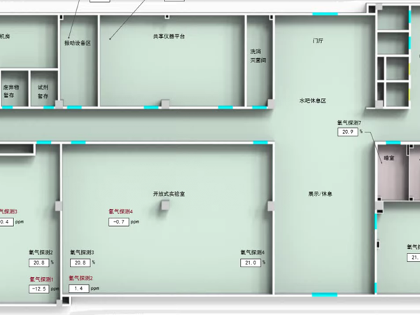 對實驗室氧氣氫氣進(jìn)行實時的監(jiān)測,超過一定限值并在上位機(jī)進(jìn)行報警,超過一定限值并實時開啟對應(yīng)排風(fēng)機(jī), 保證實驗的安全性可靠性。