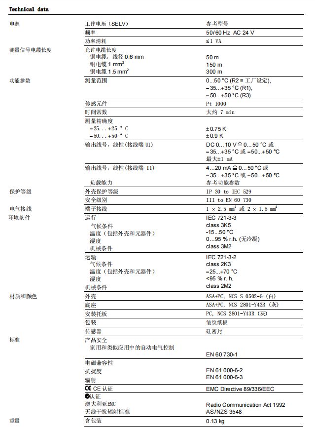 QAA2061西門子溫度傳感器室內(nèi)傳感器DC0~10v ip30